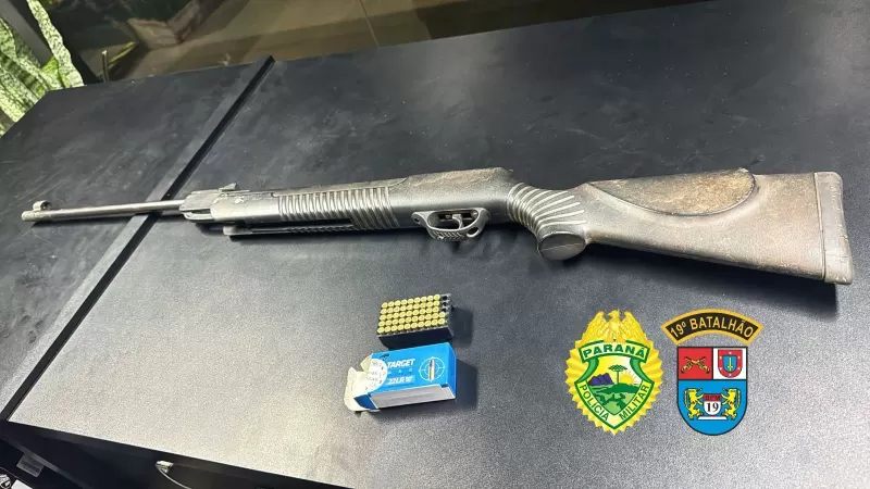 No local, os policiais identificaram uma Chevrolet Montana e no interior dela foi localizada uma carabina de pressão, modificada para calibre .22, e caixa com 47 munições do mesmo calibre.