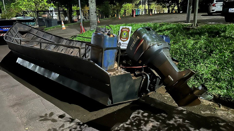 Durante patrulhamento, os policiais avistaram uma embarcação atravessando o lago partindo da margem paraguaia em direção à margem brasileira. Ao perceber a equipe policial acompanhando a movimentação, o condutor direcionou o barco para um braço do lago, perto de uma região de mata, e fugiu.