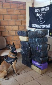 De imediato, um cão policial do canil do BPFron indicou a presença de ilícitos no veículo. No veículo, foram encontrados fardos de substância análoga a maconha totalizando 177 kg da droga.