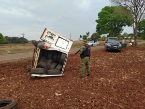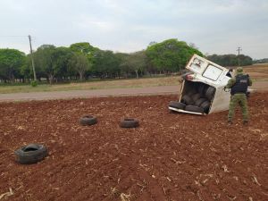 Foi dada ordem de parada, mas o condutor empreendeu fuga com o veículo e tombou na sequência. O carro estava carregado com 70 pneus contrabandeados. O condutor do veículo, um homem de 18 anos, foi detido e encaminhado com os materiais apreendidos aos procedimentos cabíveis.