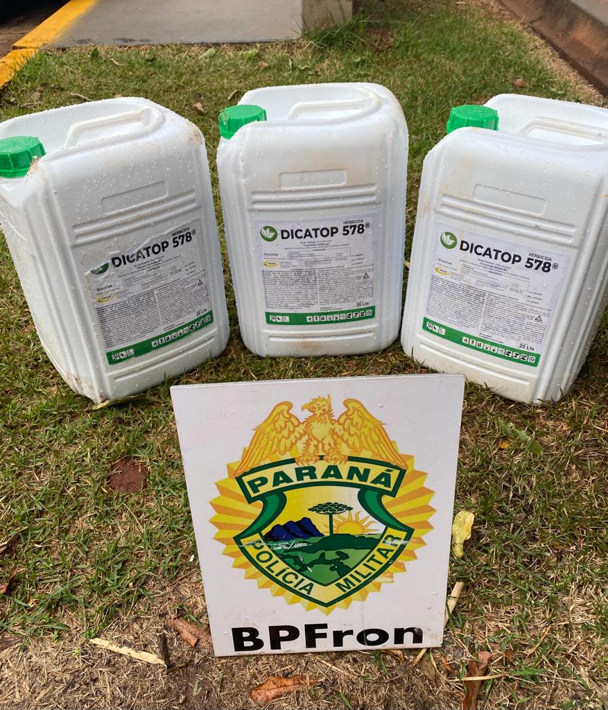 Na tarde de sexta-feira (11), por volta das 14 horas, uma ação de patrulhamento de rotina integrante da Operação Hórus resultou na apreensão de uma carga ilegal de herbicida em Guaíra. Os policiais do Batalhão de Polícia de Fronteira (BPFron) avistaram um veículo de tonalidade escura durante o patrulhamento, chamando a atenção para a carroceria que estava repleta de galões contendo o herbicida da marca “Dicatop 578”.