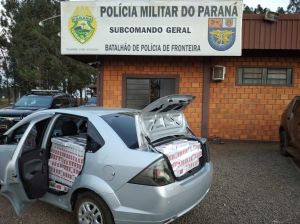 Os policiais abordaram um veículo Ford Fiesta e constataram que o veículo estava carregado com cigarros contrabandeados. O condutor, veículo e contrabando foram encaminhados para a Polícia Federal em Guaíra para os procedimentos cabíveis.