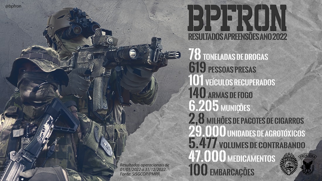 O comando do Batalhão de Polícia de Fronteira (BPFron), com sede em Marechal Cândido Rondon, apresentou, na segunda-feira (2), balanço operacional do ano de 2022 com os resultados obtidos, em grande parte, em ações conjuntas com unidades da Polícia Militar, da Polícia Civil e ações integradas com a Polícia Federal e demais forças de segurança que atuam na região de fronteira. (Veja imagem abaixo)