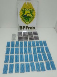 Nos bolsos de um abordado e em uma bagagem de mão foram encontrados quarenta cartelas de estimulante sexual, oito cartelas de Sibutramina e uma cartela de Cytotec. O indivíduo foi identificado e orientado quanto aos procedimentos. Já os medicamentos foram encaminhados para a Receita Federal em Santo Antônio do Sudoeste.