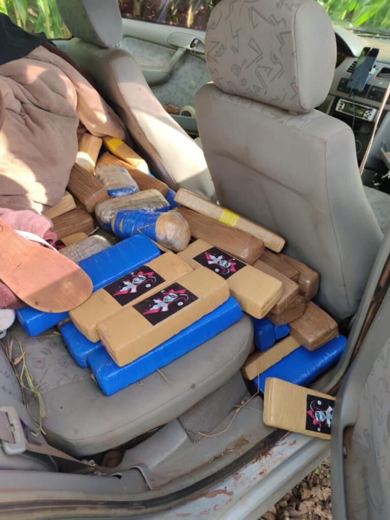 Com a aproximação policial, o condutor fugiu e abandonou o carro em uma plantação. Porém, ele e o passageiro foram abordados. O veículo estava carregado com 163,4 quilos de substância análoga à maconha, 0,625 quilo de substância análoga à crack, 4,650 quilos de substância análoga à maconha tipo.