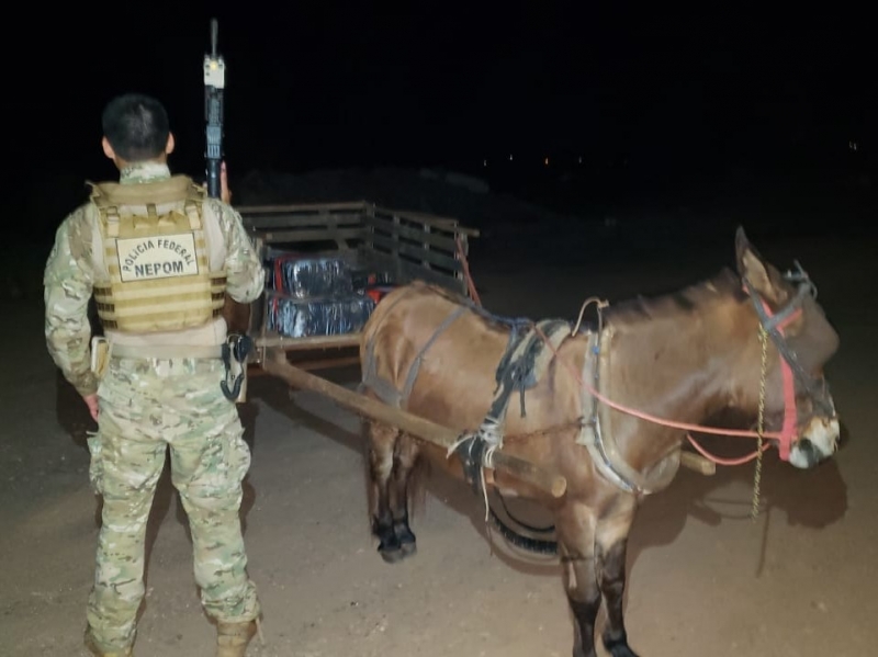 Conforme a PF, a carroça, o burro e a droga foram localizados pelos policiais às margens do Rio Paraná, nas proximidades do posto da PRF, em Guaíra.