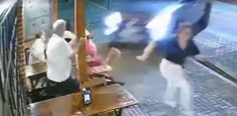 Câmeras de segurança registraram a caminhonete subindo na calçada pela contramão, cruzando a preferencial e atropelando as vítimas, que estavam sentadas em uma mesa do lado de fora da churrascaria. As imagens foram congeladas por serem muito fortes.