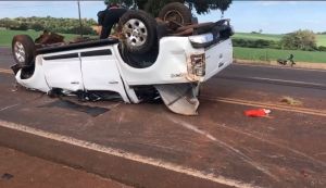 Na manhã deste domingo (11), uma caminhonete S10 de cor branca capotou na BR-163, cerca de dois quilômetros depois de Mercedes, sentido a Guaíra.