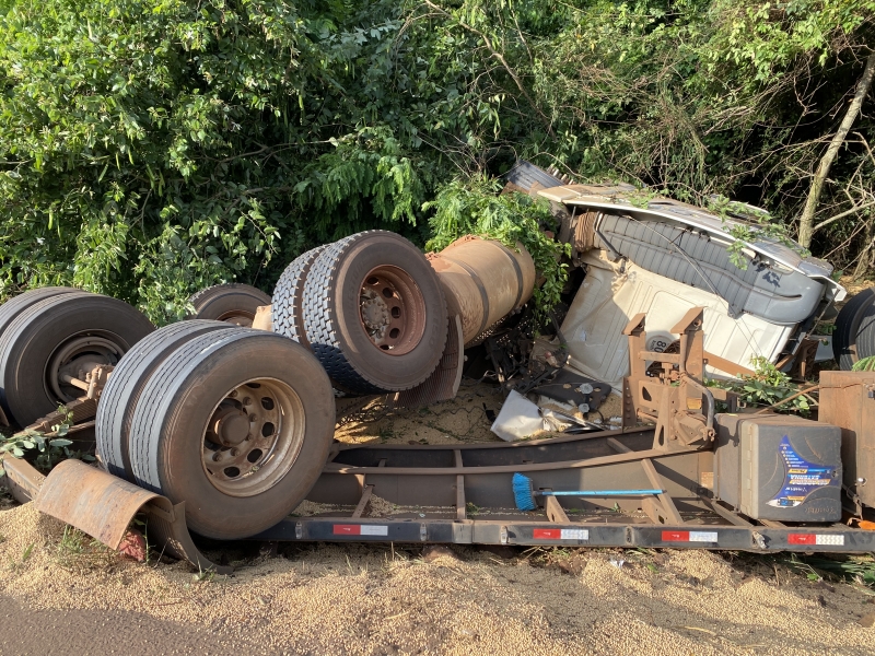 A carga de soja ficou espalhada e a carreta bastante danificada. Não há informações de feridos.
