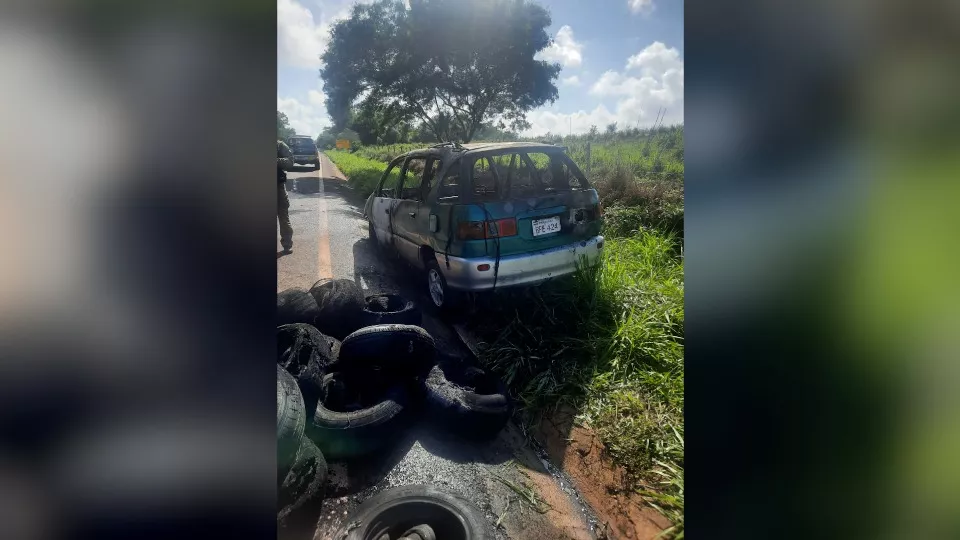 No carro os policiais encontraram 24 bobinas de pneus, totalizando 90 pneus parcialmente destruídos pelas chamas.