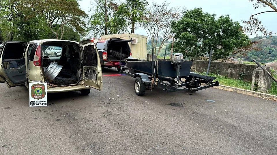 Policiais federais apreenderam carro e embarcação usados por contrabandistas, que traziam do Paraguai pneus e rodas, no início da manhã de terça-feira (8) em Foz do Iguaçu.