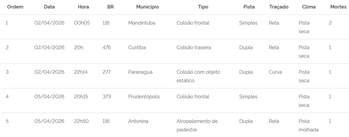 A Polícia Rodoviária Federal (PRF) registrou 112 acidentes, 106 pessoas feridas e seis mortes durante a operação Semana Santa 2026 nas rodovias federais do Paraná, realizada entre os dias dois e cinco de abril. No feriado do ano passado, foram registrados 110 acidentes, 119 pessoas feridas e sete mortes. Na ocasião, a operação teve cinco dias e abarcou também o feriado de Tiradentes.