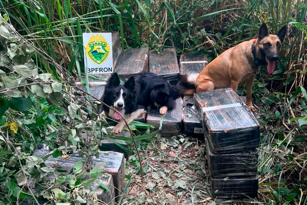 Uma equipe do Pelotão de Operações com cães do Batalhão de Fronteira da Polícia Militar do Paraná (BPFron), com ajuda dos cães farejadores Atena e Johnny, localizaram em área de mata no interior de Santa Helena, 914,600 kg de maconha.