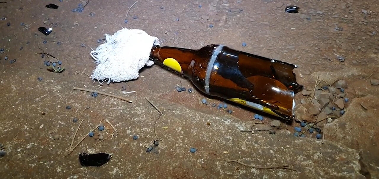 Próximo à janela da casa ficaram os restos da garrafa utilizada na fabricação do coquetel molotov. Outra incendiária foi encontrada na calçada em frente ao imóvel.