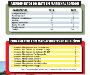 O cruzamento da Avenida Maripá com a Rua Pernambuco foi o local de maior número de acidentes de trânsito em Marechal Cândido Rondon no ano passado. Entre 1º de janeiro e 31 de dezembro o local foi palco de cinco ocorrências. Os números não são expressivos, mas praticamente todos os acidentes atendidos pela equipe do Serviço Integrado de Atendimento ao Trauma em Emergência (Siate) do Corpo de Bombeiros têm ao menos uma vítima, independente da intensidade do ferimento. É o que salienta o sub-comandante do Corpo de Bombeiros, tenente Lucas Schlögl.