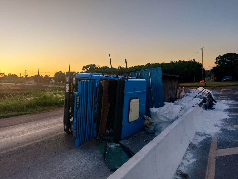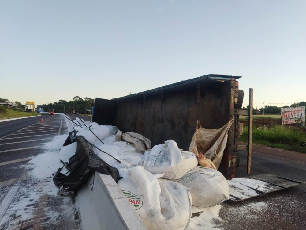 A ocorrência envolveu uma carreta Scania com placas do Paraguai, que era acoplada por um reboque, e tombou logo após a rotatória de entrada da cidade, no sentido Marechal a Guaíra.