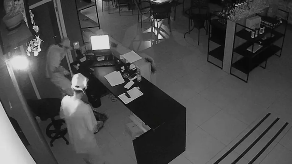 No vídeo é possível ver que às 3h37 a dupla chega ao local e arromba o estabelecimento. Os envolvidos conseguiram retirar o vidro sem quebrá-lo.
