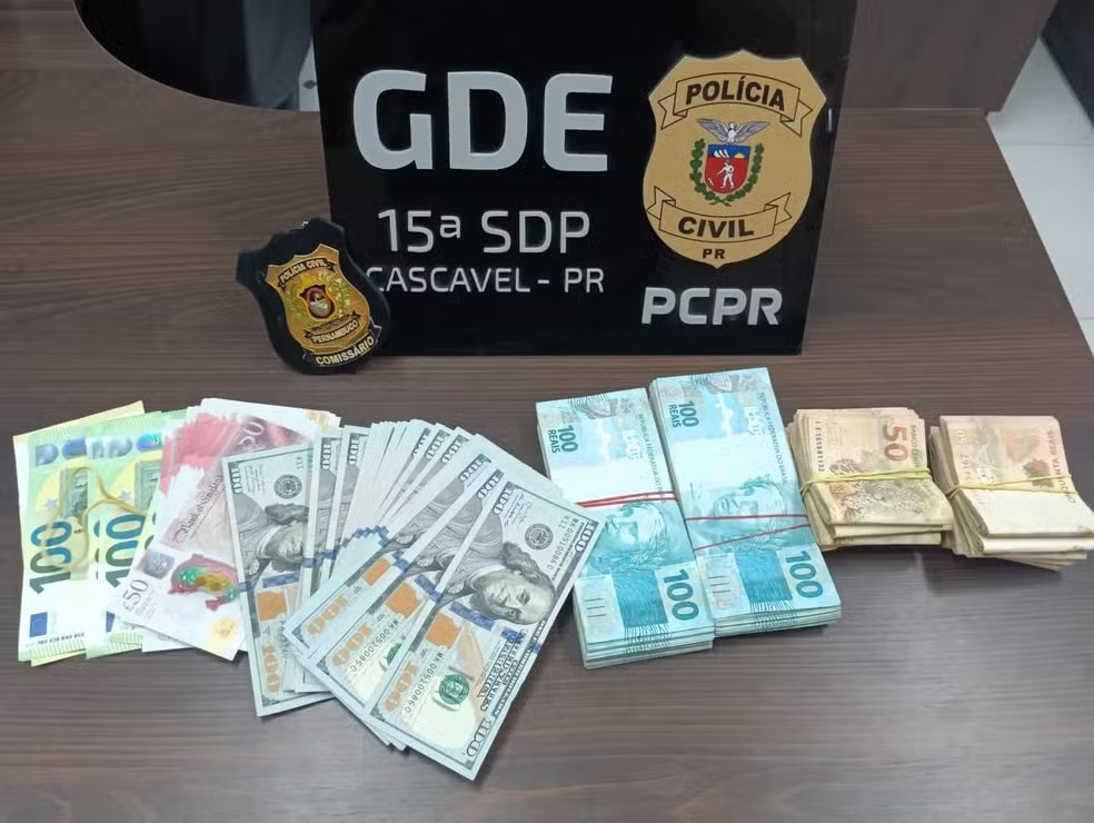 Um empresário foi preso em Cascavel. Com ele, foram apreendidos o equivalente a R$ 70 mil, em diferentes moedas. Outro não foi localizado em Curitiba e é considerado foragido. A empresa afirma que ele “está em viagem profissional no exterior há vários dias”.