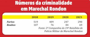 Depois de dois anos em queda, as ocorrências de furto voltaram a crescer em 2021 em Marechal Rondon, mas “se mantêm estáveis e menores em relação aos anos de 2019 e 2018”, aponta o comandante.