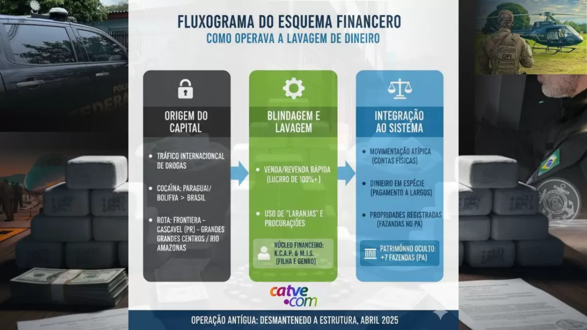 As investigações da Operação Antígua detalham que K.C.A.P e seu companheiro, M. J. S., atuavam como “laranjas” e gestores do patrimônio da organização. O casal, que residia no Pará, era responsável pela lavagem do dinheiro obtido com o tráfico. As provas incluem: