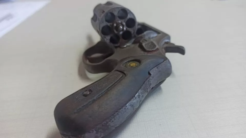 Durante a abordagem, um dos suspeitos tentou dispensar a arma perto de uma árvore. No local, os policiais encontraram o revólver calibre .32 da marca Taurus, com a numeração raspada.