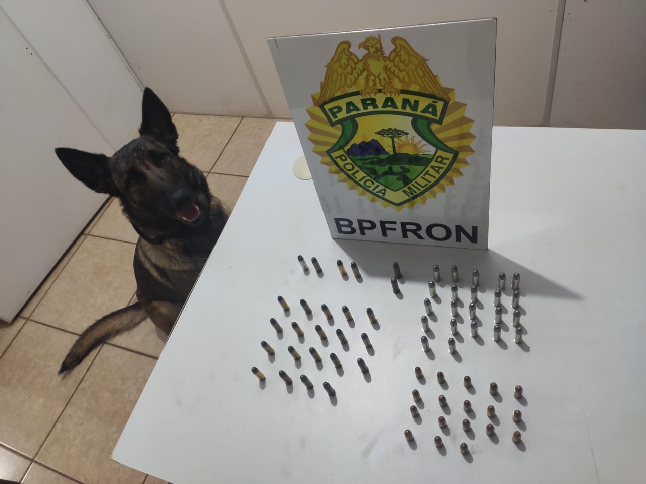 A equipe logrou êxito em localizar o veículo e em busca com a semovente canino, esta indicou algo no porta-luvas do veículo, onde foram localizadas 65 munições de calibre ponto 38 e 9mm. Desta forma foi dado voz de prisão ao proprietário do veículo, que foi encaminhado à Delegacia da Polícia Civil.
