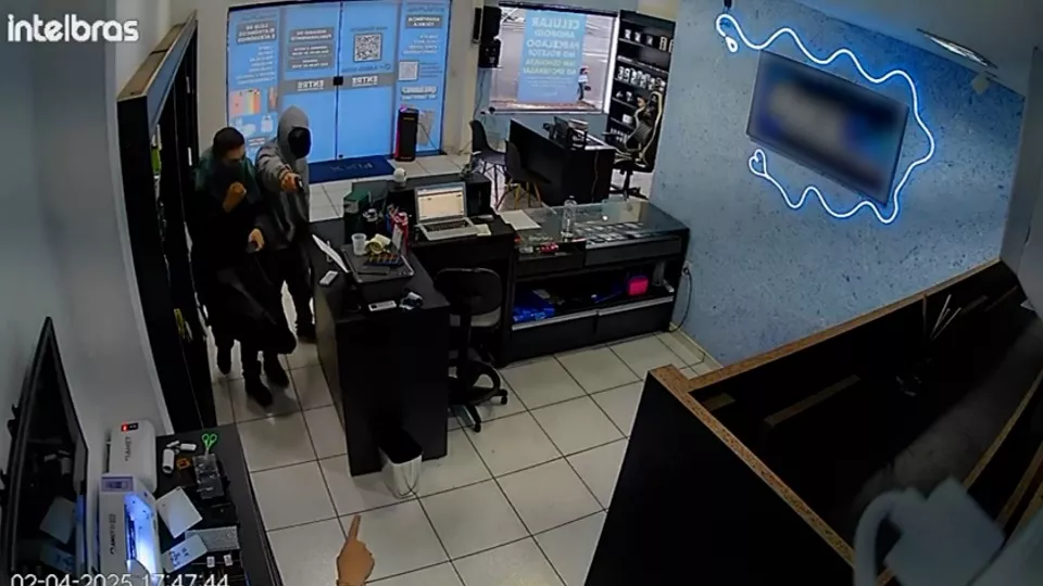 Os criminosos logo em seguida começam a recolher o dinheiro do caixa e também aparelhos celulares que estavam expostos, colocando os itens na bolsa.