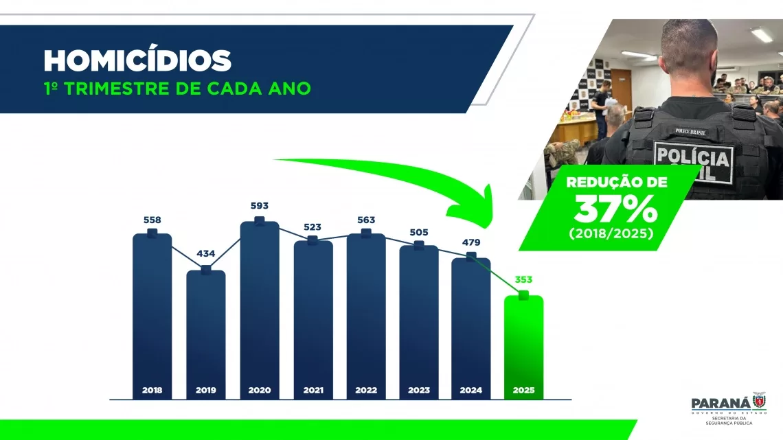 A melhoria dos índices de segurança pública do Paraná em 2025, que superaram até mesmo as marcas recordes obtidas em 2024, seguem uma tendência iniciada em 2019 no Estado. Do 1.º trimestre de 2018, ano anterior ao início da atual gestão estadual atual, até o 1º trimestre de 2025, a queda nas ocorrências foi generalizada.