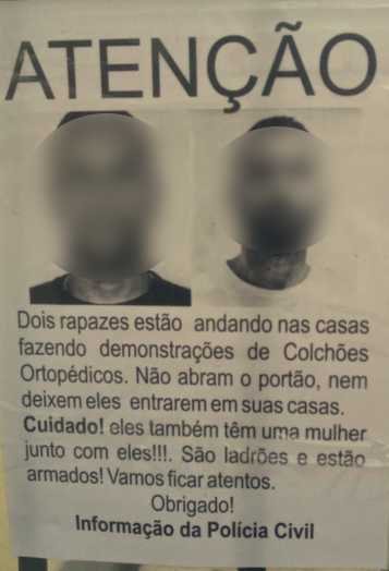 O aviso, com pedido de atenção, assinado como informação da Polícia Civil, alerta para dois rapazes que se passam por vendedores, fazendo demonstrações de colchões ortopédicos. A orientação que consta na imagem é para que as pessoas não deixem estes cidadãos entrarem em suas casas, pois eles seriam ladrões e estariam armados.