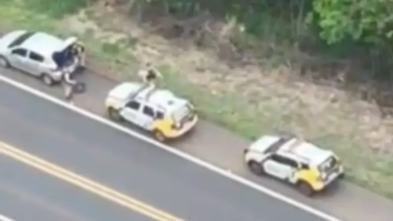 Imagens aéreas do Batalhão de Polícia Militar de Operações Aéreas (BPMOA) registraram o momento em que equipes da Polícia Militar do Paraná (PMPR) interceptaram Renault Sandero prata usado no transporte de drogas na BR-163, entre Lindoeste e Capitão Leônidas Marques, na tarde de domingo (16).
