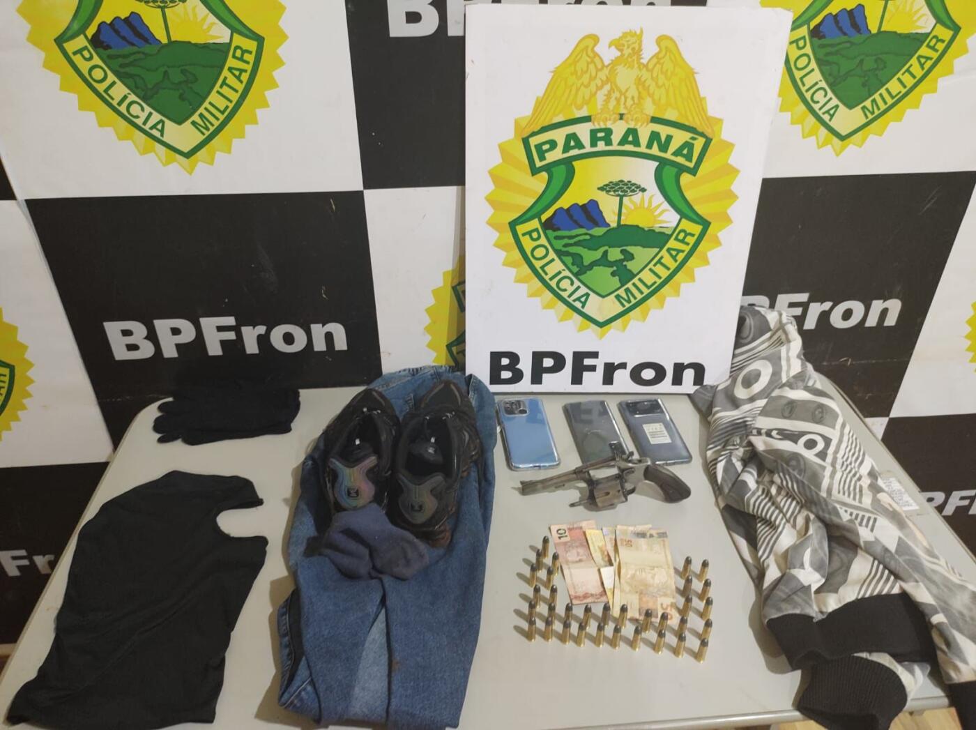 Após buscas no automóvel, o BPFron localizou um revólver calibre 38 da marca Rossi com cinco munições, além de outras 29 munições calibre 38, R$ 180 em espécie, dois celulares e roupas semelhante às usadas no roubo registrado domingo em Guaíra.