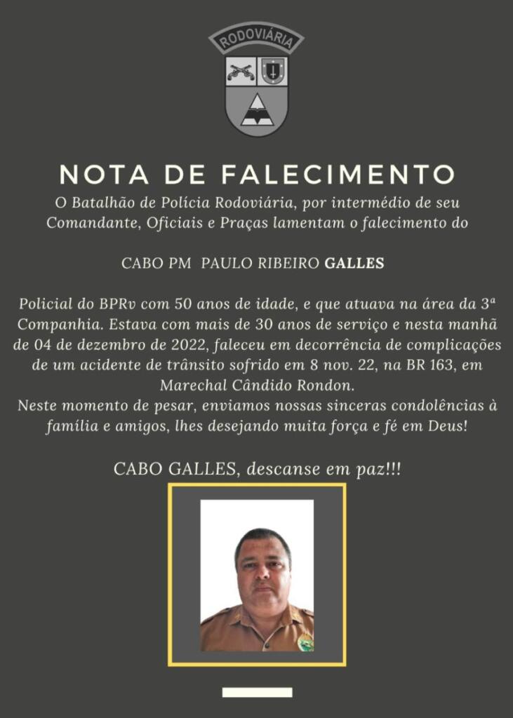 O cabo da Polícia Rodoviária Estadual, Paulo Ribeiro Galles, faleceu na manhã de hoje (04) em decorrência de um acidente sofrido no dia 08 de novembro, na BR-163 em Marechal Cândido Rondon. Relembre o acidente clicando AQUI.