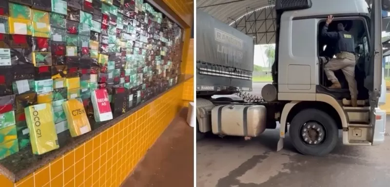 Durante fiscalização, a equipe PRF localizou um fundo falso na cabine de uma carreta, que estava repleto de aparelhos celulares de marcas diversas.