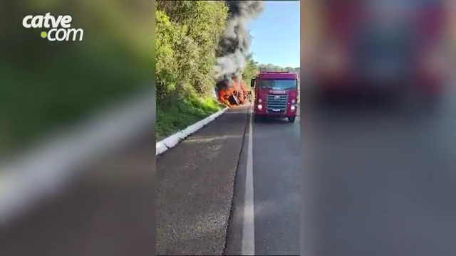 Segundo a Polícia Rodoviária Federal (PRF), o condutor tombou o veículo de carga sobre o acostamento e conseguiu sair, sem ser atingido pelas chamas.