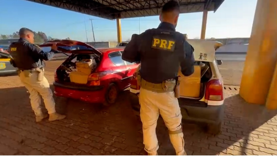 As equipes da Polícia Rodoviária Federal (PRF) abordaram os condutores de dois veículos carregados com cigarros contrabandeados do Paraguai, cigarros eletrônicos, minoxidil e pomadas para tatuagem.