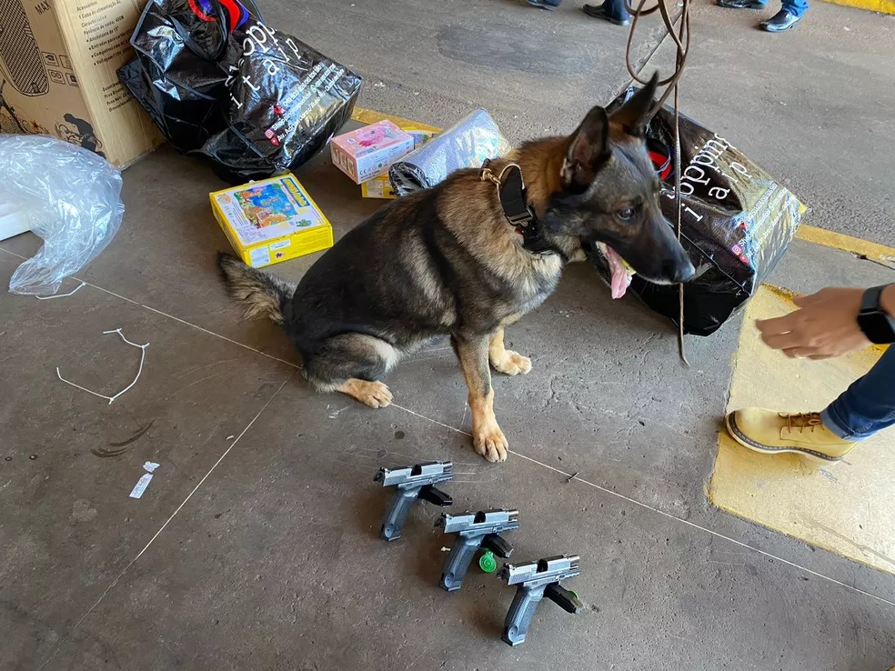 Ao revistar uma bagagem que continha uma caixa de som, o cachorro demonstrou interesse, segundo o Denarc. Desta forma, ao realizar vistoria mais minuciosa, os policiais encontraram as armas de calibre 9mm e 6 carregadores.