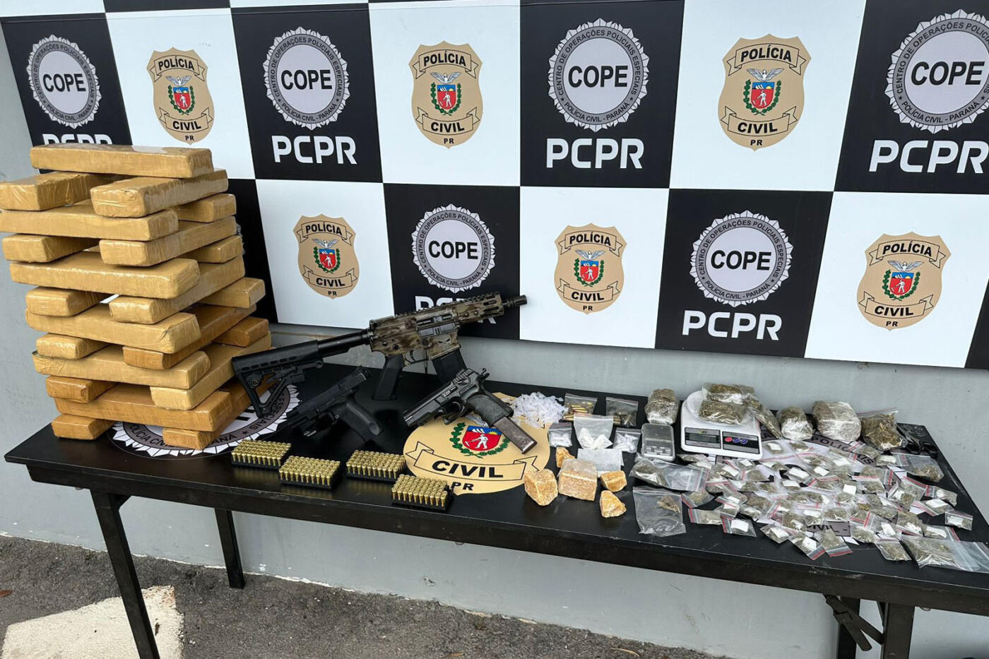Nesta nova ação, a PCPR localizou e apreendeu, em uma residência no bairro Tatuquara, duas pistolas, um fuzil e mais de 200 cartuchos de munição. Também foram apreendidos 20 quilos de maconha e porções de crack e cocaína.