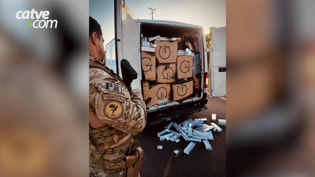 Imagens da Polícia Rodoviária Federal (PRF) mostram o momento em que uma van carregada com cigarros contrabandeados foi abordada pela equipe do Núcleo de Operações Especiais de Fronteira.