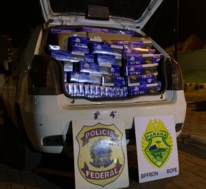 A ação integrada entre Polícia Federal, Batalhão de Polícia de Fronteira e Batalhão de Operações Policiais Especiais resultou na apreensão de um Fiat/Pálio carregado com aproximadamente 15 mil carteiras de cigarros contrabandeados, acarretando um prejuízo total estimado em R$ 100 mil ao crime organizado.