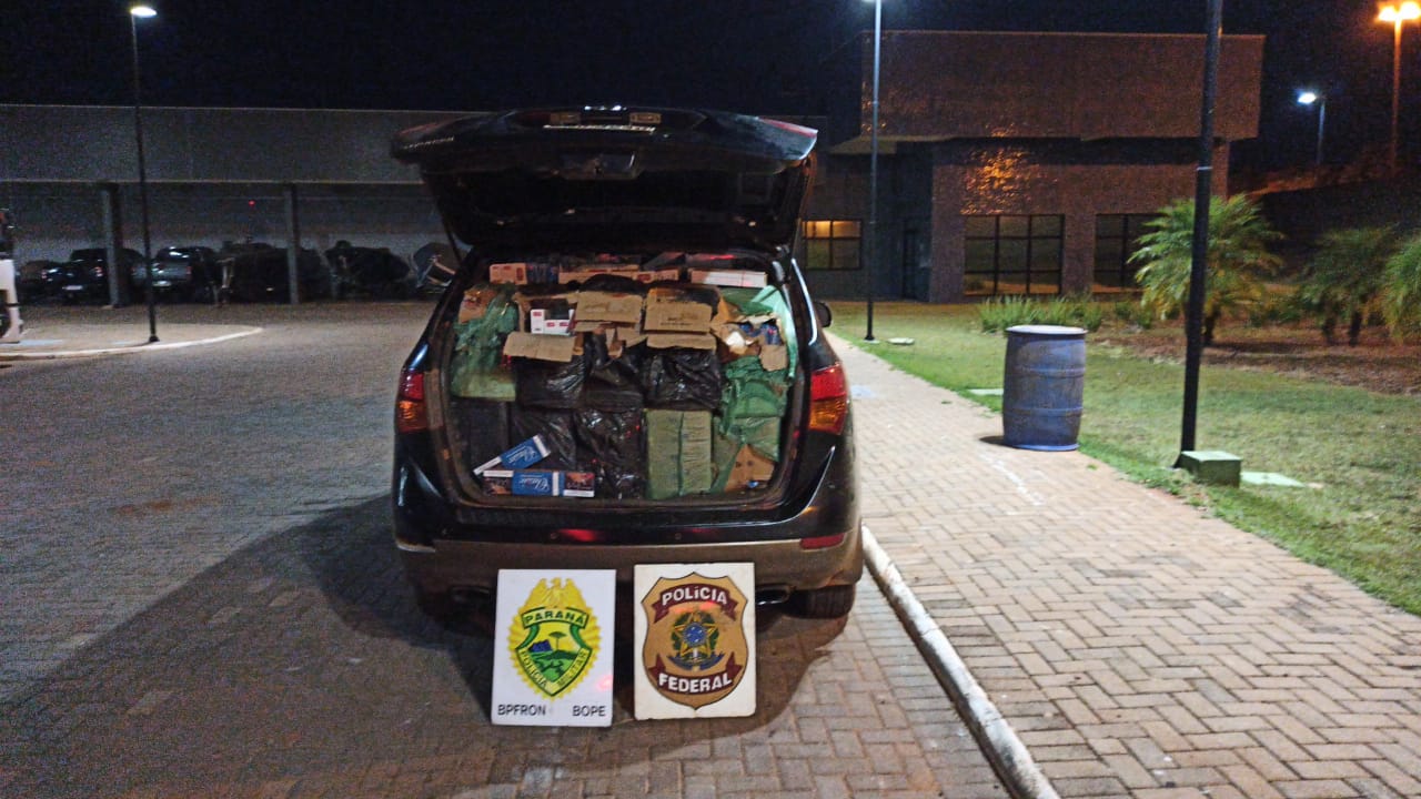 A ação integrada entre Polícia Federal e Cobra-BPFron e COE-Bope da PMPR resultou na apreensão de um Hyundai Vera Cruz carregado com aproximadamente 60 caixas de cigarros paraguaios, acarretando um prejuízo estimado em R$ 200 mil ao crime organizado.
