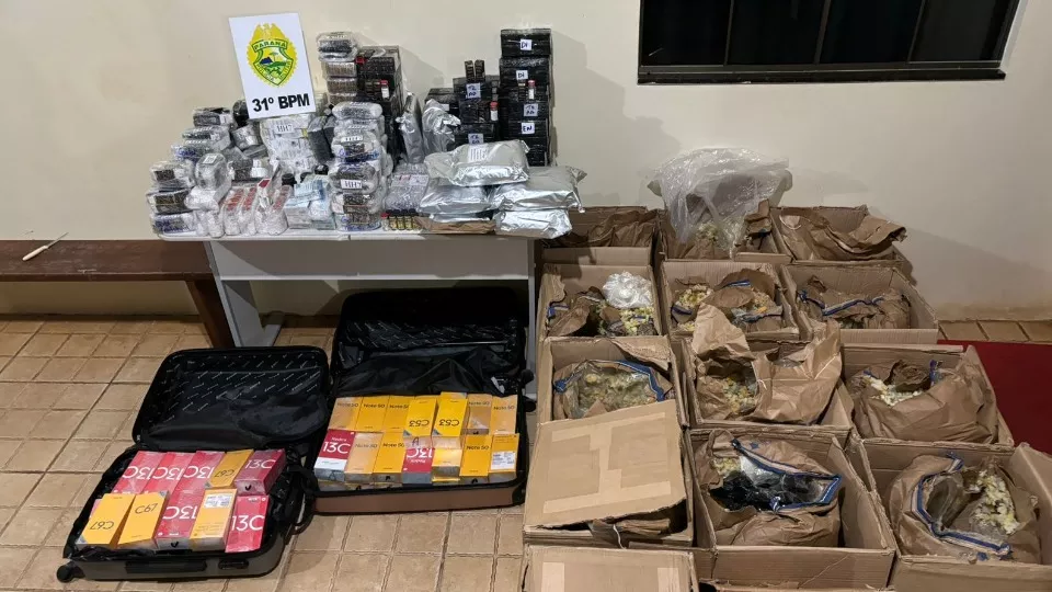 Caixas de anabolizantes e malas cheias de celulares foram apreendidas pela Polícia Militar em Corbélia, na madrugada de quinta-feira (27).