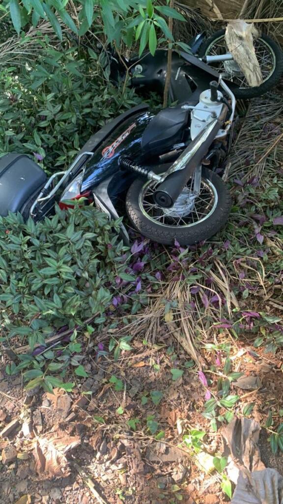 A Honda Biz foi abandonada com pequenas avarias em meio a um mato no final da Rua Pernambuco, sendo encontrada por policiais civis.