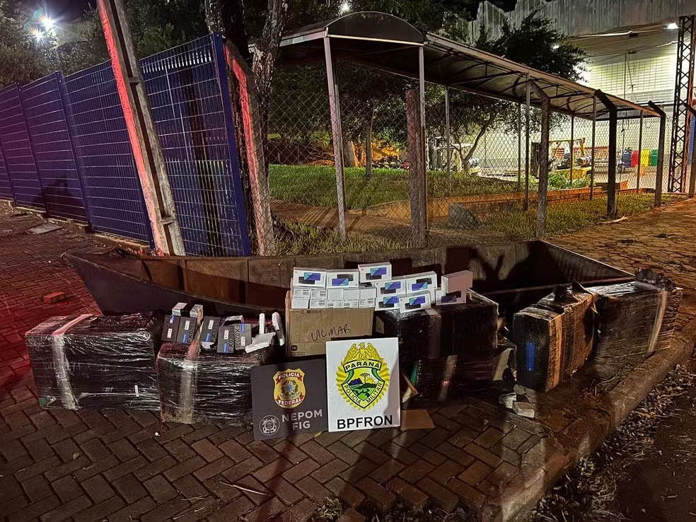 Um barco a remo foi flagrado transportando dezenas de eletrônicos contrabandeados do Paraguai no Rio Paraná, em Foz do Iguaçu.