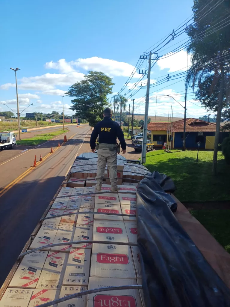A Polícia Rodoviária Federal (PRF) apreendeu cerca de 600 mil maços de cigarros na tarde de domingo (15), durante fiscalização no quilômetro 370 da BR-163, em Quatro Pontes (PR).