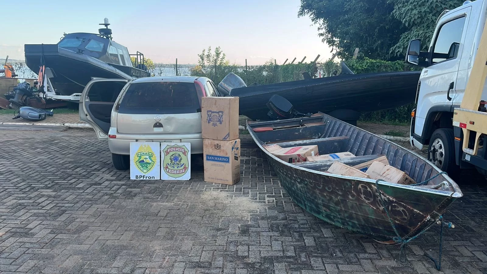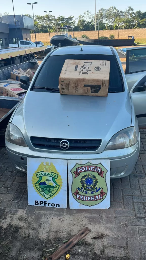 Na terça-feira (13), a Polícia Militar do Paraná, por meio do Batalhão de Polícia de Fronteira (BPFron), e o Nepom da Polícia Federal realizavam patrulhamento em Mercedes-PR, mais precisamente no Arroio Guaçu, quando em determinado momento avistaram um barco atracado com caixas de cigarros na margem do rio Paraná e um veículo GM Corsa próximo ao barco com algumas pessoas realizando o transbordo da carga da embarcação para o veículo.