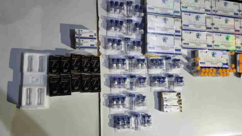 Durante a inspeção, os agentes encontraram canetas e ampolas do fármaco Mounjaro, medicamento usado para emagrecimento cuja importação e transporte sem autorização são proibidos no Brasil. Também foram identificados anabolizantes e outras substâncias de controle especial.