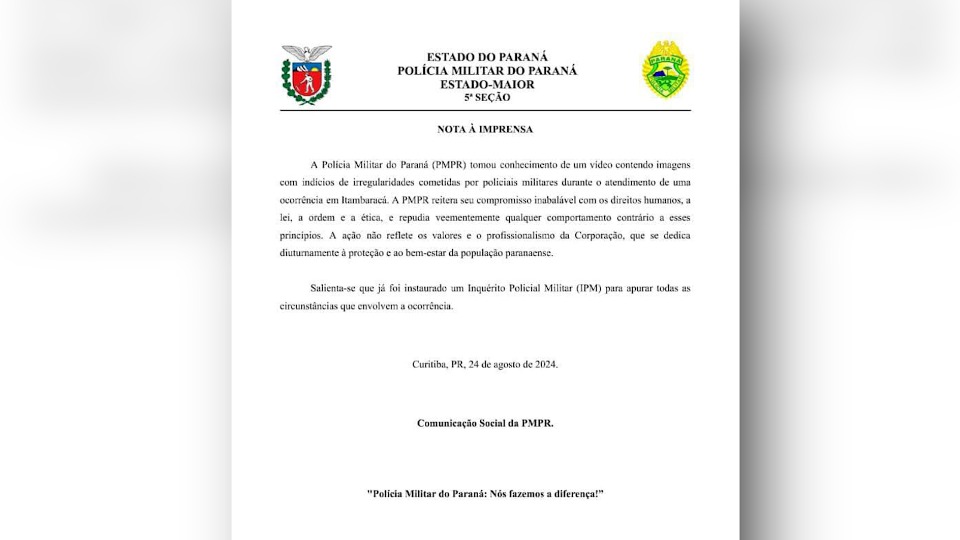 A Polícia Militar do Paraná (PMPR) tomou conhecimento de um vídeo contendo imagens com indícios de irregularidades cometidas por policiais militares durante o atendimento de uma ocorrência em Itambaracá. A PMPR reitera seu compromisso inabalável com os direitos humanos, a lei, a ordem e a ética, e repudia veementemente qualquer comportamento contrário a esses princípios. A ação não reflete os valores e o profissionalismo da Corporação, que se dedica diuturnamente à proteção e ao bem-estar da população paranaense.