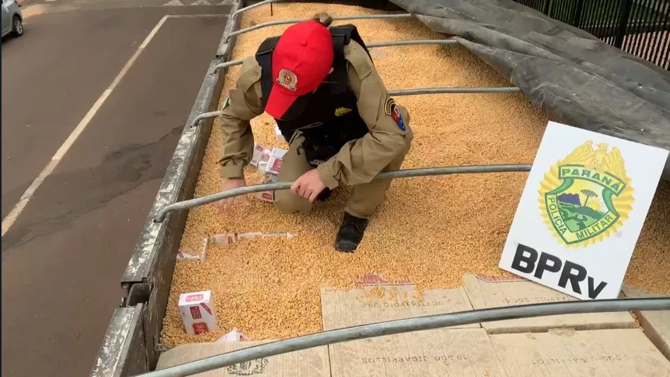 Uma equipe da 3ª Cia do Batalhão de Polícia Rodoviária de Cascavel realizou uma grande apreensão de cigarros na madrugada de quinta-feira (19). O contrabando estava escondido em meio a uma carga de milho, transportado em um caminhão bitrem. A carga seria levada de Ponta Porã para Curitiba.