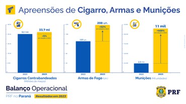 O trabalho da PRF também trouxe resultado positivo no combate ao tráfico de armas e munições no Paraná . Em relação a 2022, as apreensões de armas de fogo aumentaram 52% —passaram de 137 para 208 armas, de diferentes calibres. Já as apreensões de munições quase quintuplicaram —saltaram de 2,3 mil para 11 mil unidades.