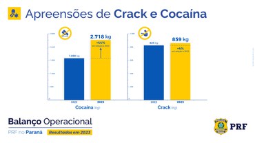 A droga mais apreendida em 2023 no Paraná foi a maconha e seus derivados (192 toneladas), seguida por cocaína (2,7 toneladas) e pelo crack (859 quilos). No total, 576 pessoas foram detidas pela PRF por tráfico de drogas no estado. Dentre as regiões do estado, a que mais apreendeu maconha foi a região oeste (Cascavel) e a que mais apreendeu cocaína foi a região centro-oeste (Guarapuava).